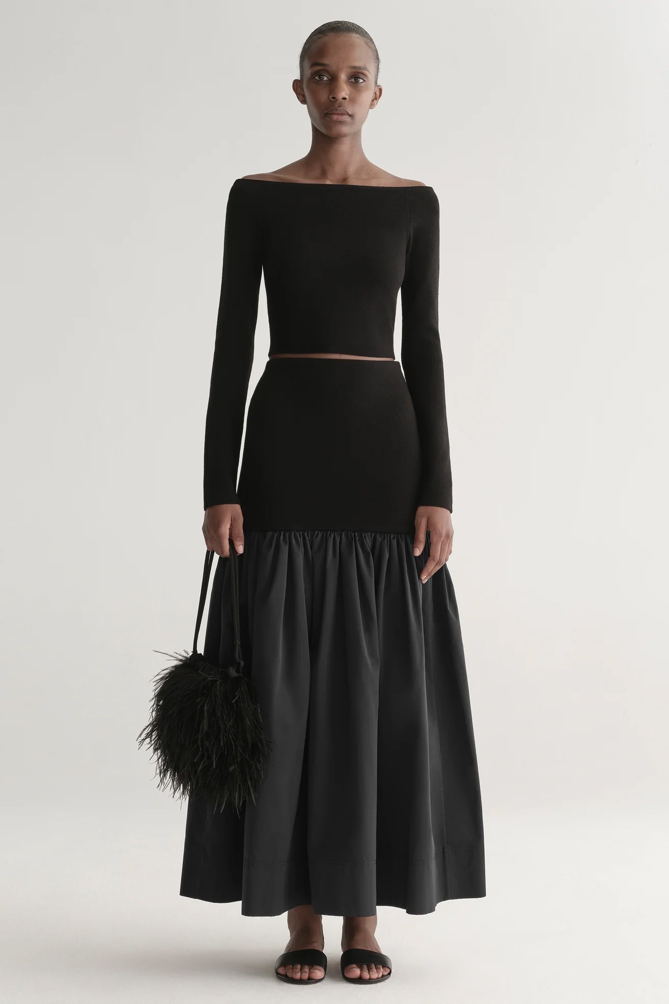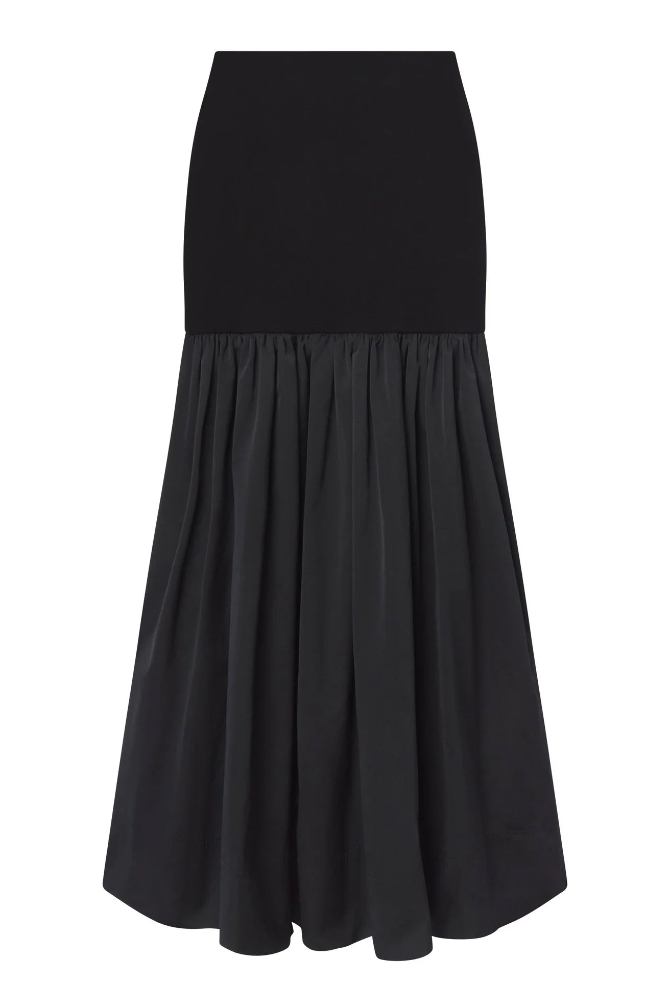 The Cami Skirt is a modern ballroom-inspired maxi designed to elevate your evenings. Crafted from 100% stretch merino wool, the fitted high-rise mini panel contrasts sharply with the gathered skirt, creating a bold, sculptural silhouette. Lightweight yet structured, it holds shape and adds instant drama to any look.
