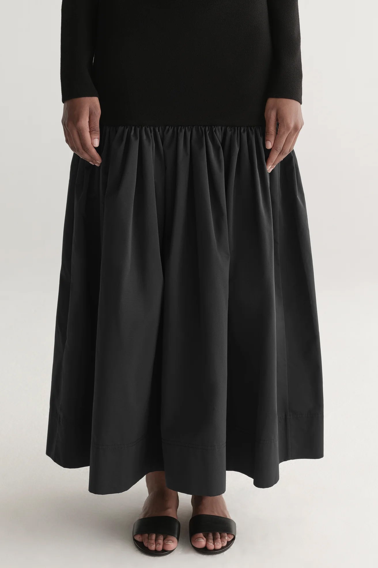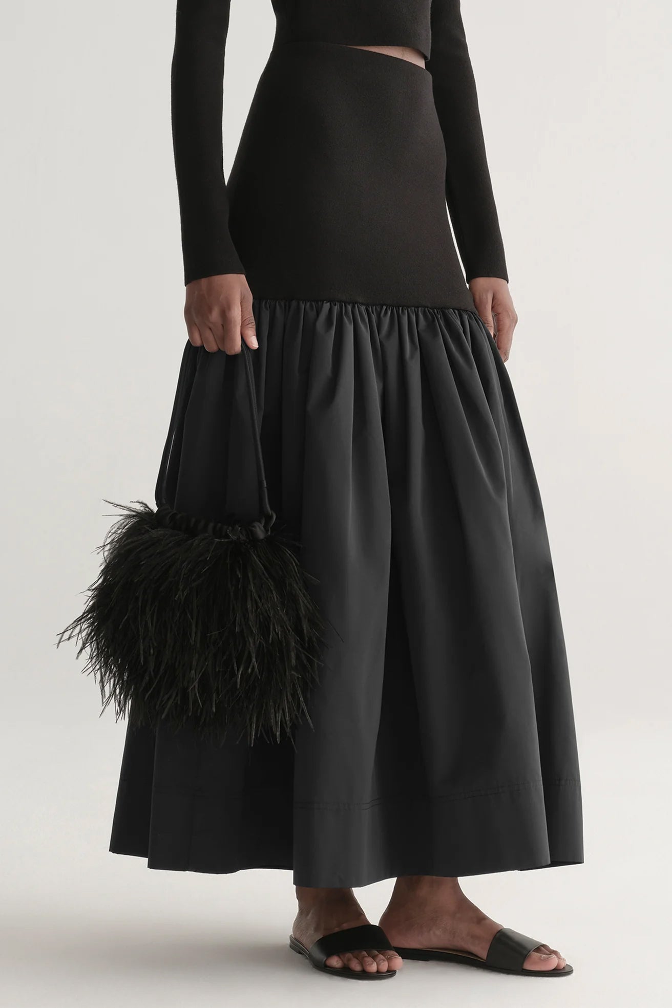 - High-rise fitted mini panel with contrasting gathered maxi hem for bold volume