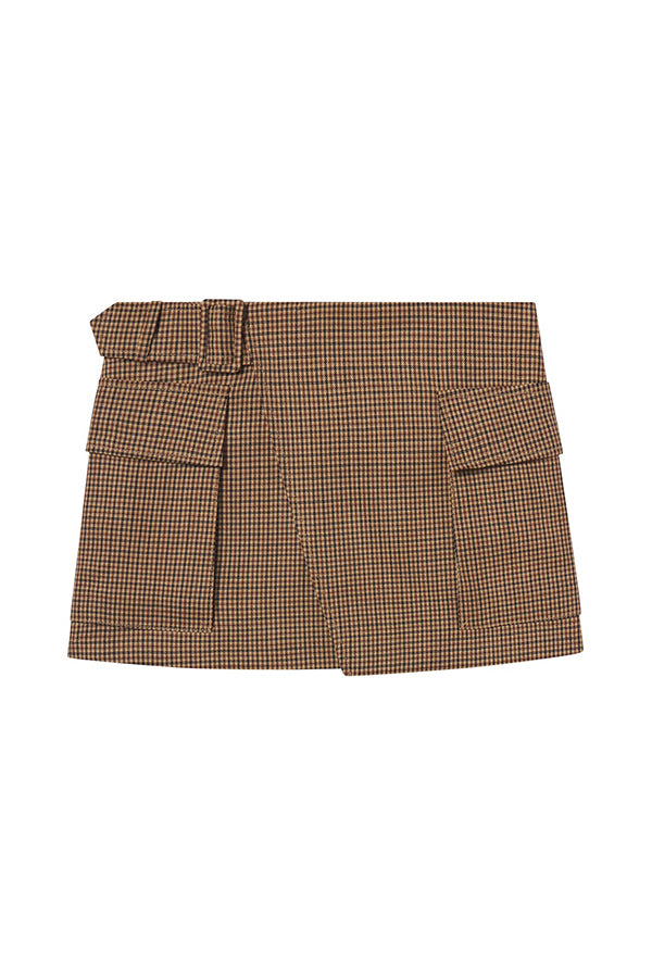 A micro check style woven from Italian wool. The utility-inspired wrap silhouette features flap pockets and a buckled waist. Lined. Button Closure.