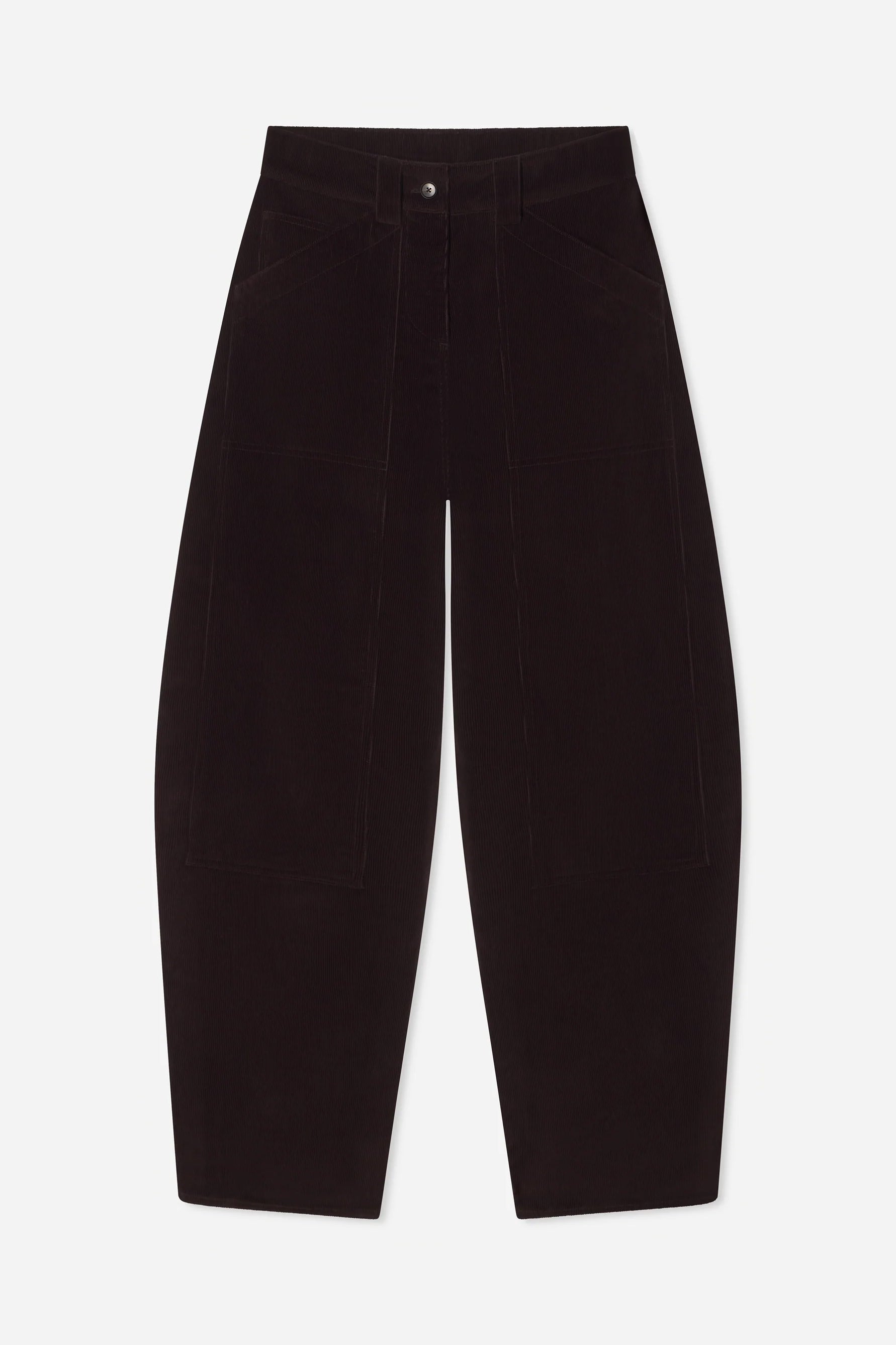 These high-waisted trousers are crafted in wide-wale corduroy and shaped with a sculptural barrel leg. Details include oversized patch pockets, tailored seaming, and a clean waistband. The rich chocolate tone enhances the dimensional surface, striking a balance between structure and ease.