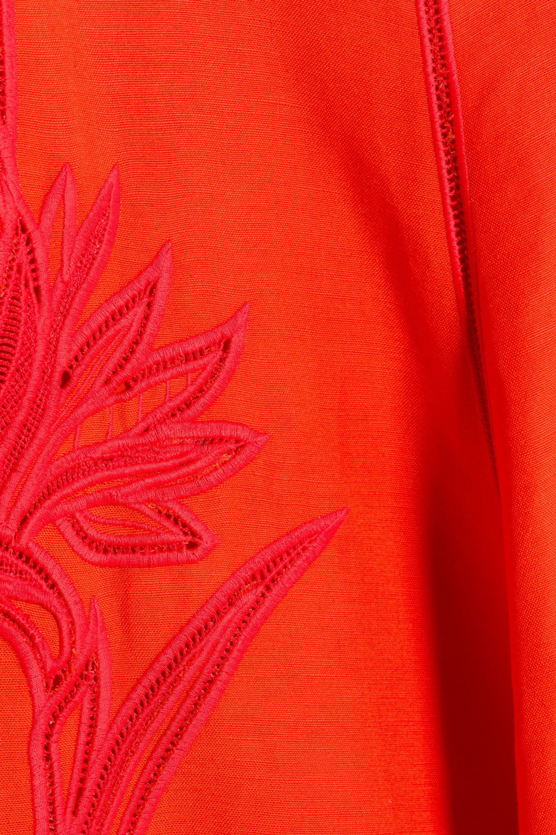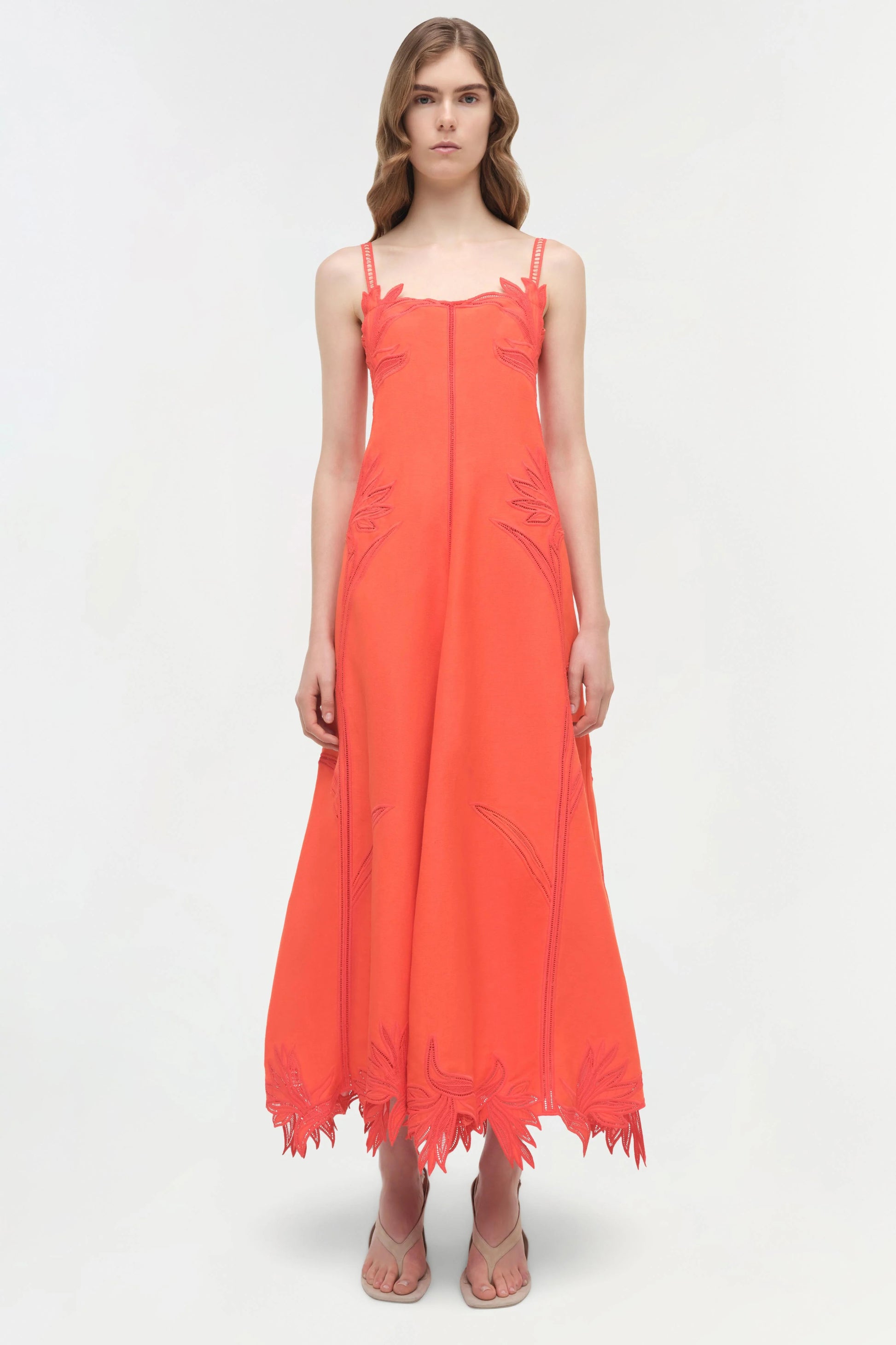 The Ellery Embroidered Bustier Midi Dress in Lobster. This midi dress is cut from linen-blend broderie anglaise and detailed with abstract floral embroidery. A central seam structures the dress while the raw-cut, uneven hem allows fluid movement.