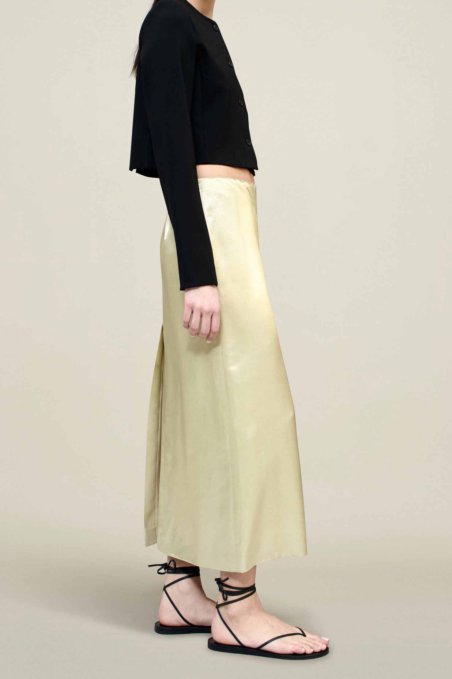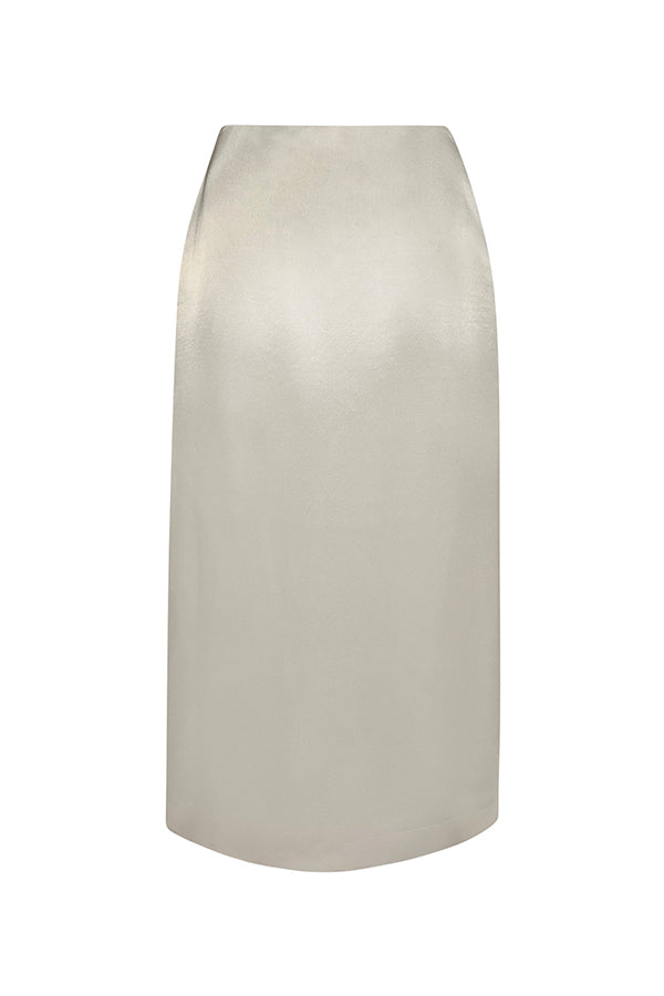 Modern midi pencil skirt in lustrous liquid viscose twill. Back slit provides movement while maintaining the sleek silhouette. Clean tailored construction with fitted cut through hips and thighs. Designed to sit slightly below natural waist with subtle shaping for a flattering profile. Smooth satin twill creates beautiful drape and sophisticated finish. Proudly Made in New York.