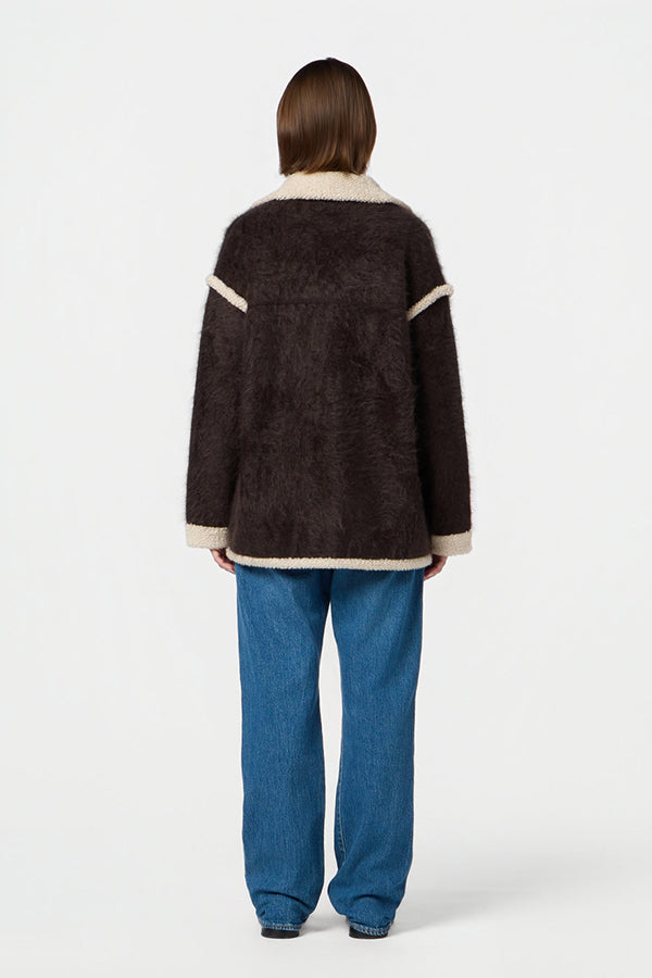Brushed cashmere jacket. Shearling style. Mid-weight. Grizzly brushed effect. Front closure with fabric covered buttons. Contrasting knitted shearling collar, cuffs, hem & pocket detail. Two front patch pockets.