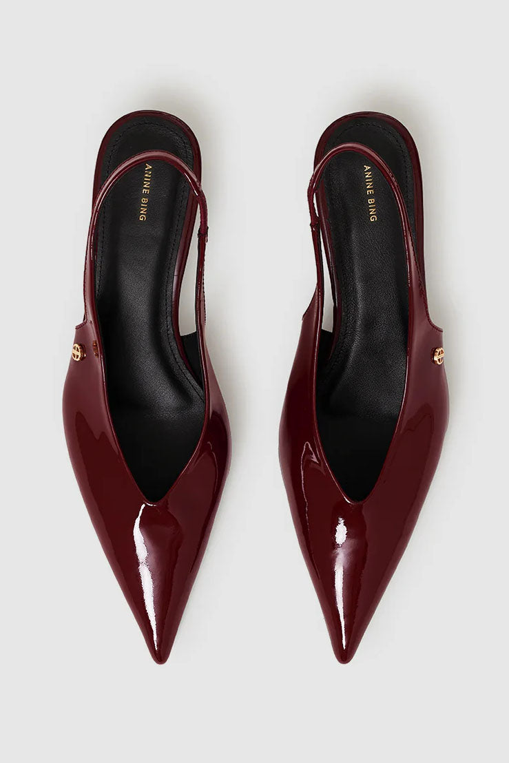 An elegant slingback pump made from rich burgundy leather with a high-shine finish. The Hilda Pumps' sleek construction features a sharp pointed toe, angular kitten heel, high-shine outsole, and cushioned insole. Accented with gold-tone ANINE BING hardware at each heel.