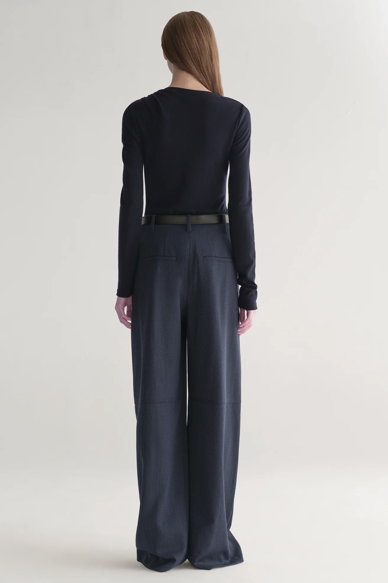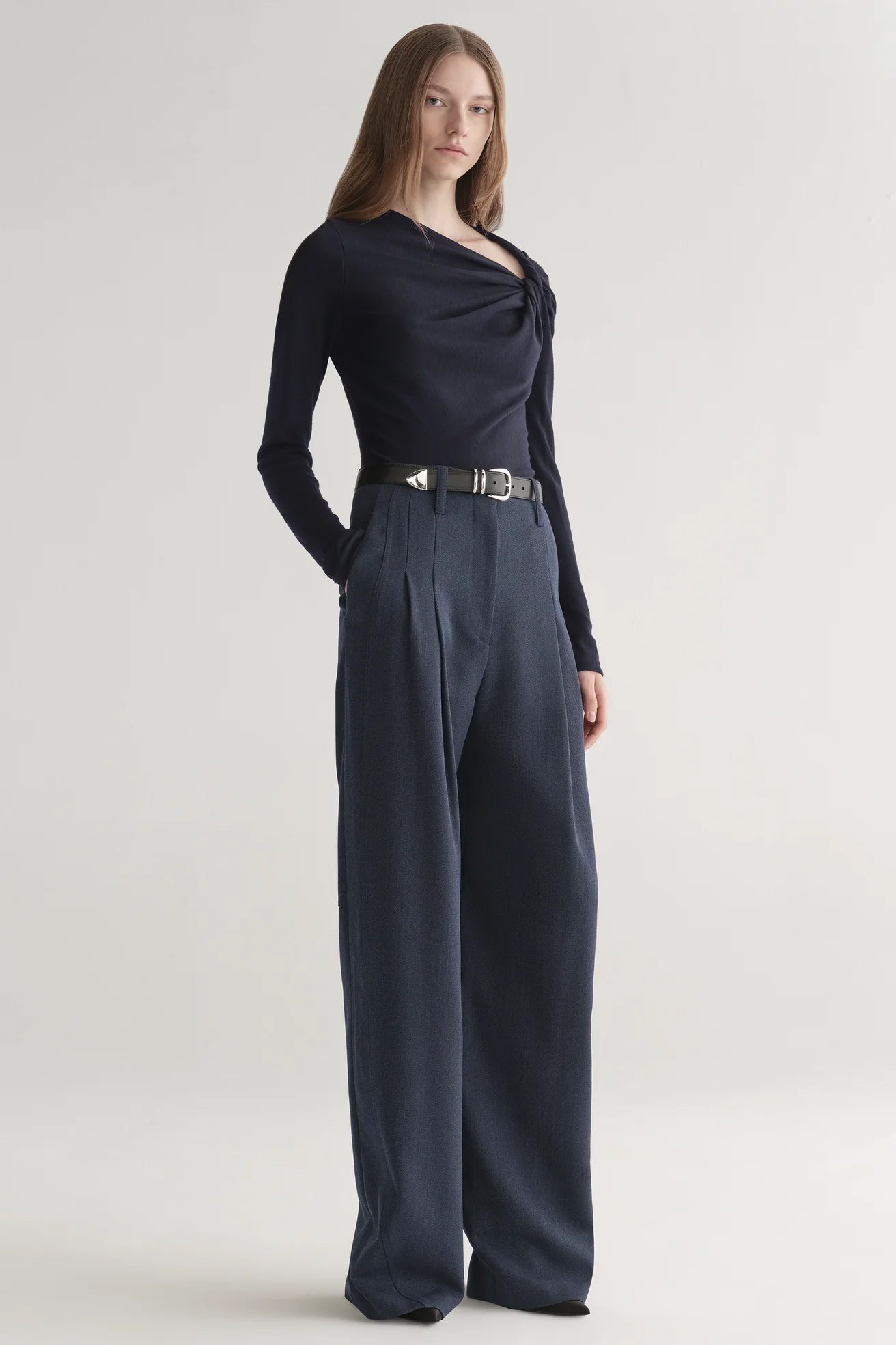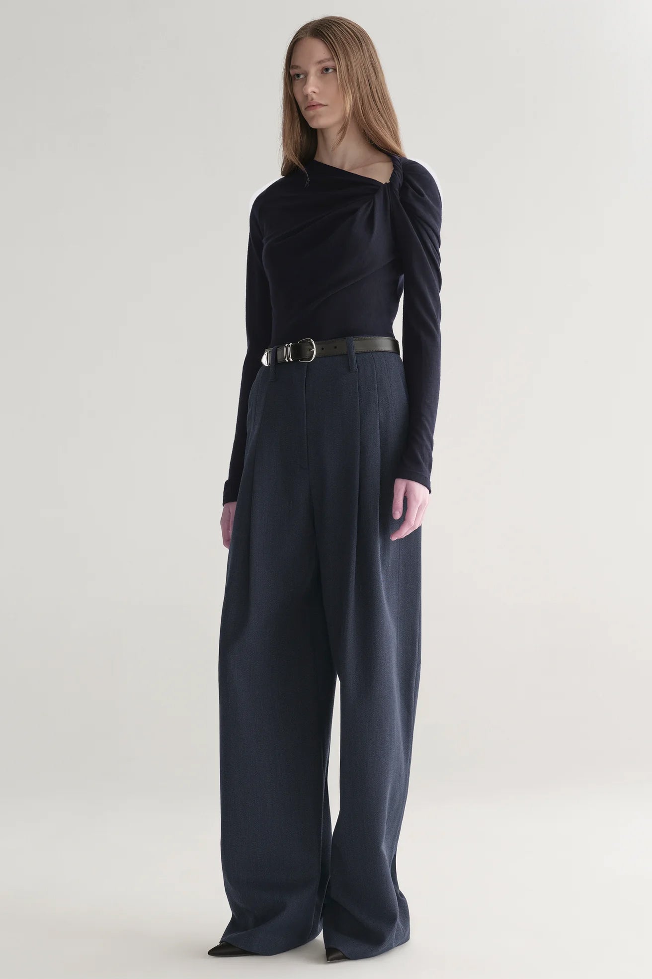 The Lizzy Top is crafted from lightweight wool jersey in a deep navy blue. This asymmetrical silhouette features a twist at the shoulder, creating a subtle drape across the fitted body and offering a sleek, modern look for everyday sophistication.