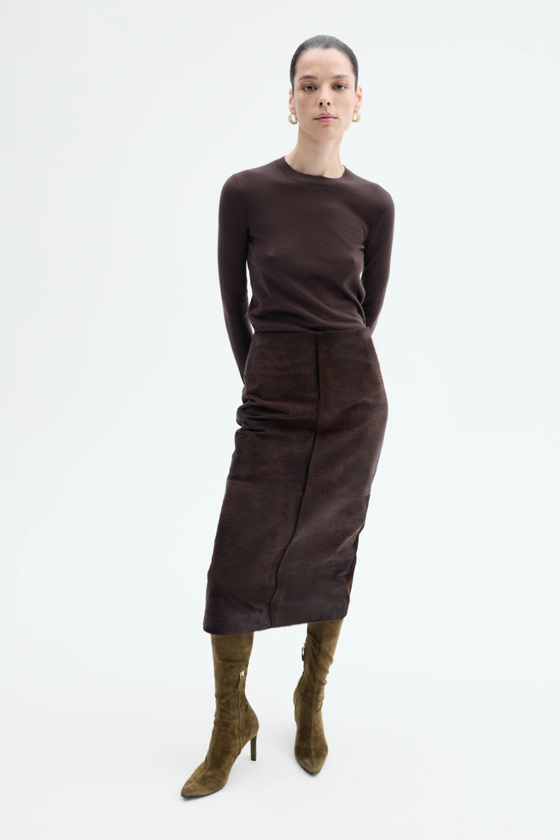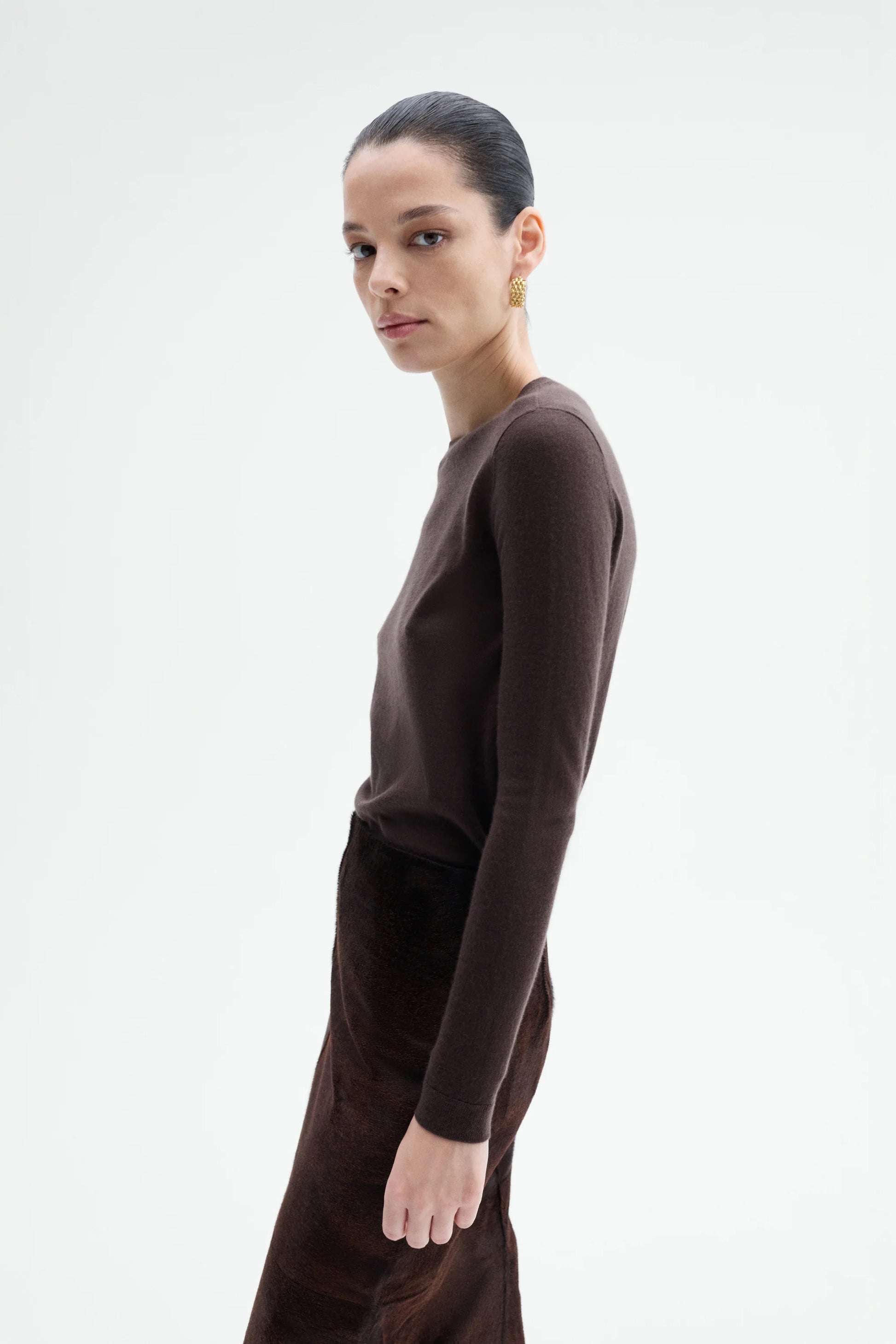 A lightweight long-sleeve top in fine cashmere, designed for a sleek, second-skin fit. Finished with ribbed detailing at the neckline and hem.