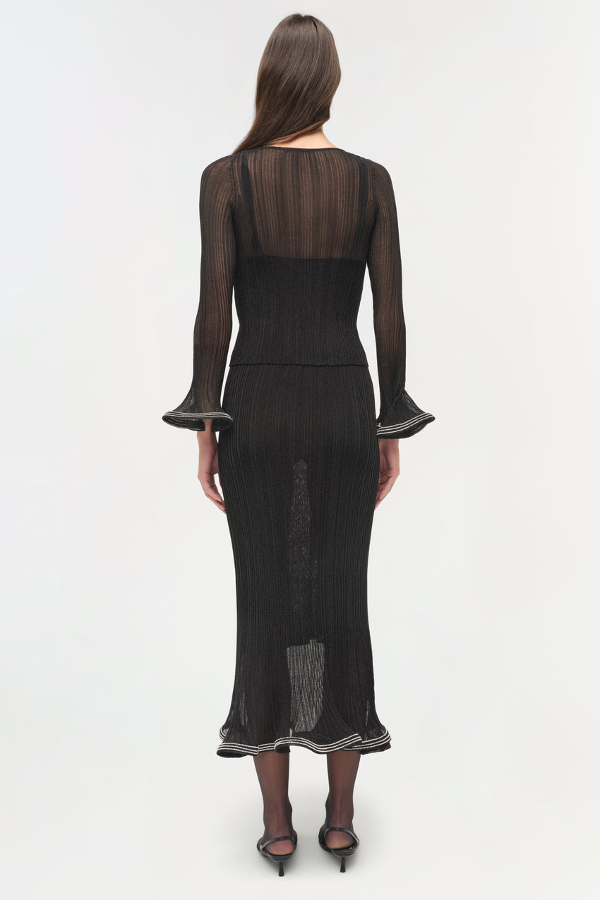 Crafted in a fine plisse knit, this top catches the light with a subtle metallic finish. Designed with a sheer overlay and an integrated tank, creating depth and dimension in a single piece. Fluted embellished cuffs complete the silhouette with a refined, sculptural detail.