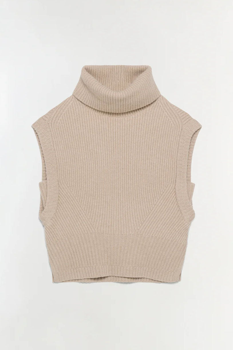 The Maple Wool Cashmere Top in Oatmeal. A wool cashmere blend sleeveless top that features a turtleneck and barely grazed shoulders.