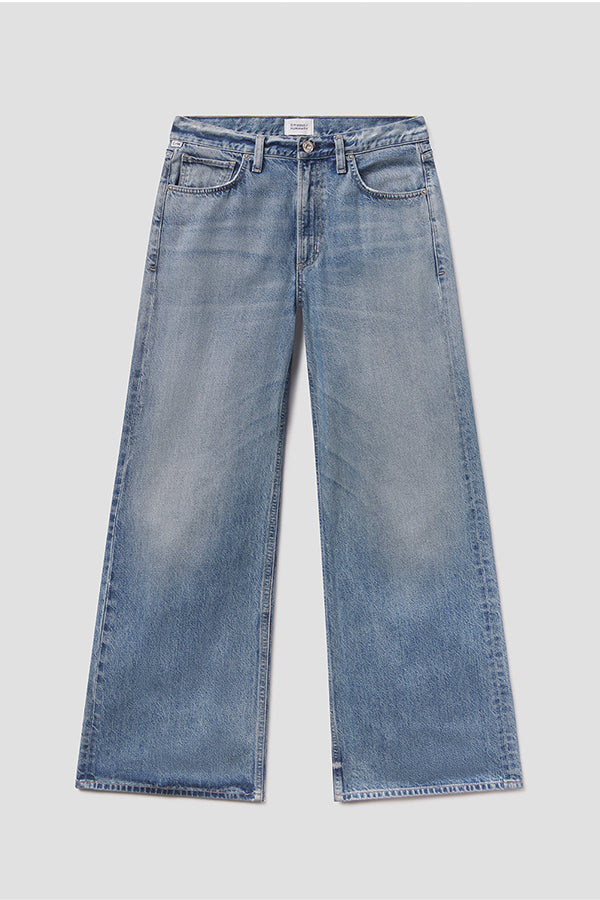 The ‘Paloma’ is a high-rise baggy jean with a wide, full-length leg and a relaxed drape through the hip. Crafted from rigid recycled cotton denim with a soft, broken-in feel, it delivers a vintage sensibility with modern ease. Jete is a classic medium indigo wash—style with a structured blazer or slim tank for contrast.