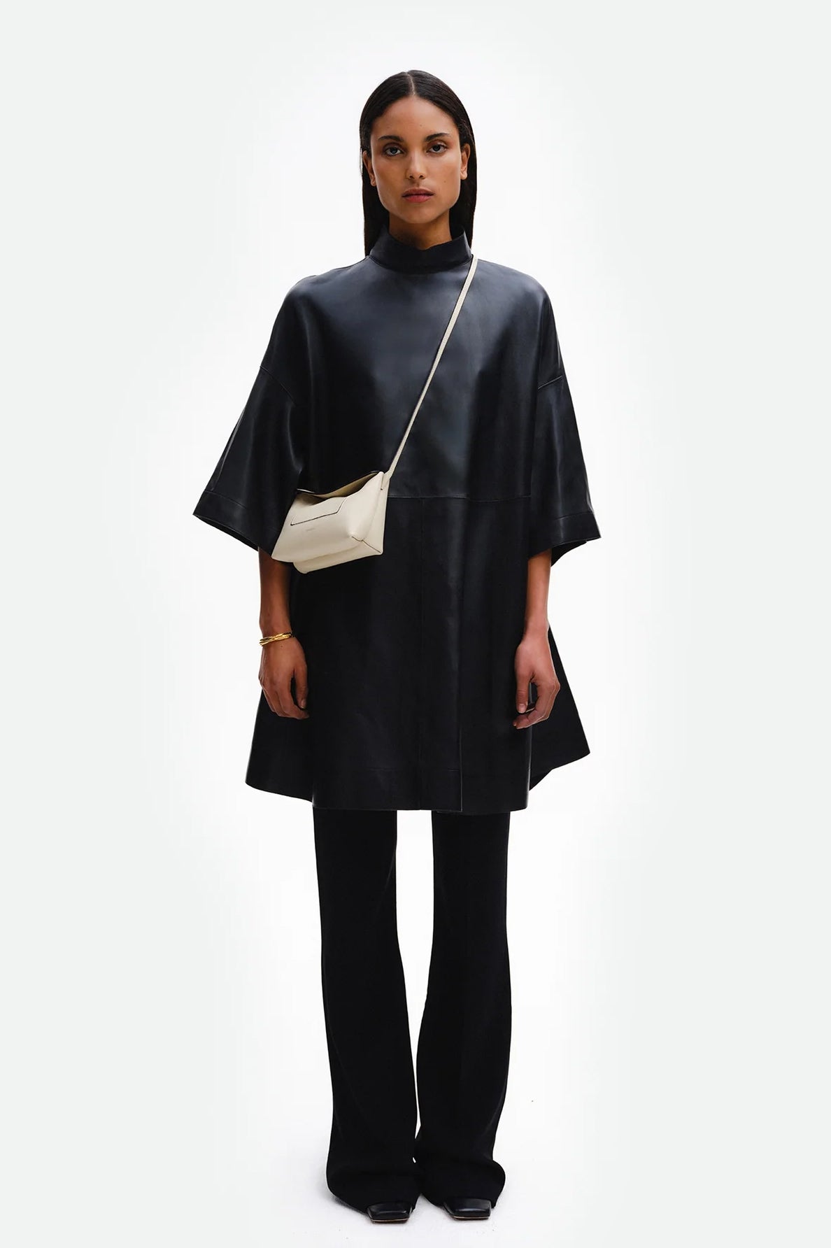 The Penelope Slouch Mini Bag features a slim shoulder strap, adjustable to 6 different lengths, a zipper, magnetic closure and back pocket. Can be worn as a handbag or crossbody. Black hand-painted edges