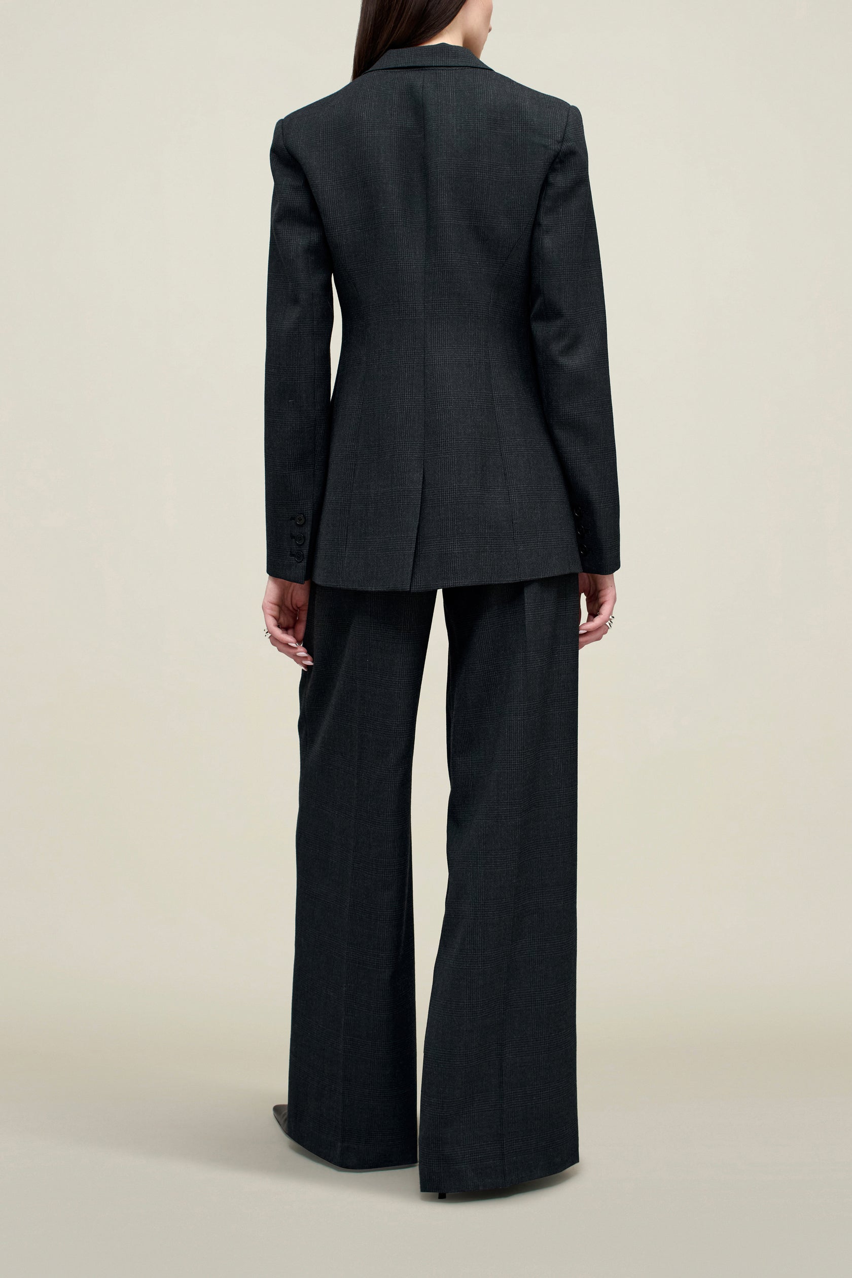 A refined single-breasted blazer with sharp lines, a nipped-in waist, and a single button closure for a sculpted silhouette. Designed to fall below the hip, it features front flap pockets, a single back vent, and full lining for a flawless fit. Crafted in grey plaid wool suiting, pairs seamlessly with the Roxana Low-Rise Trouser for sleek suiting.