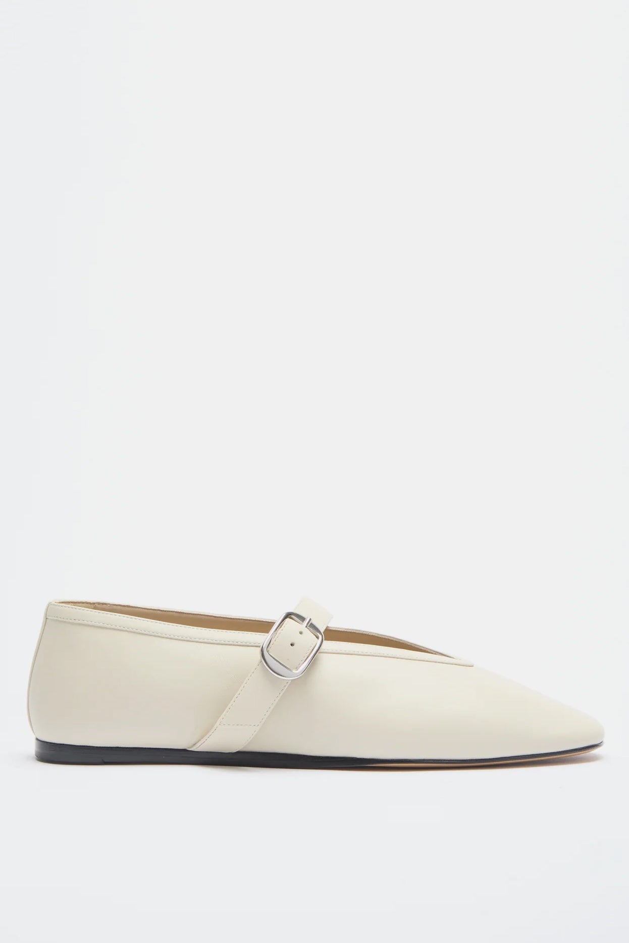 Stella Slipper in ecru lamb leather with buckle-fastening, a cushioned calf leather insole and leather piping. 8mm heel.