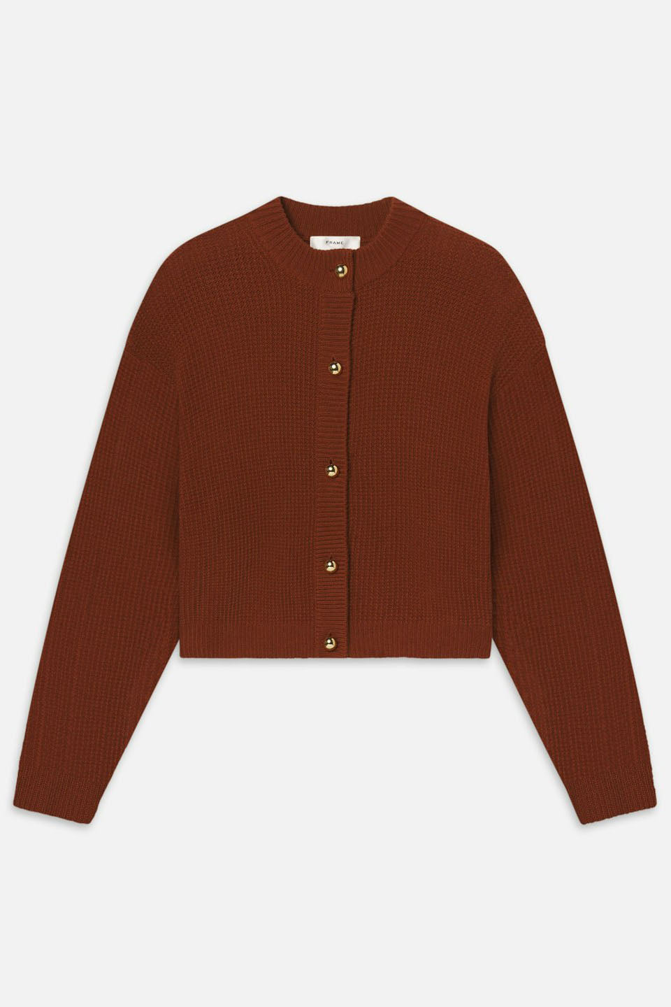 Your new favorite cardigan. Simple yet playful, with an oversized, swingy body, balloon sleeves and chic oversized buttons. In a warm rust-colored waffle knit cashmere blend.