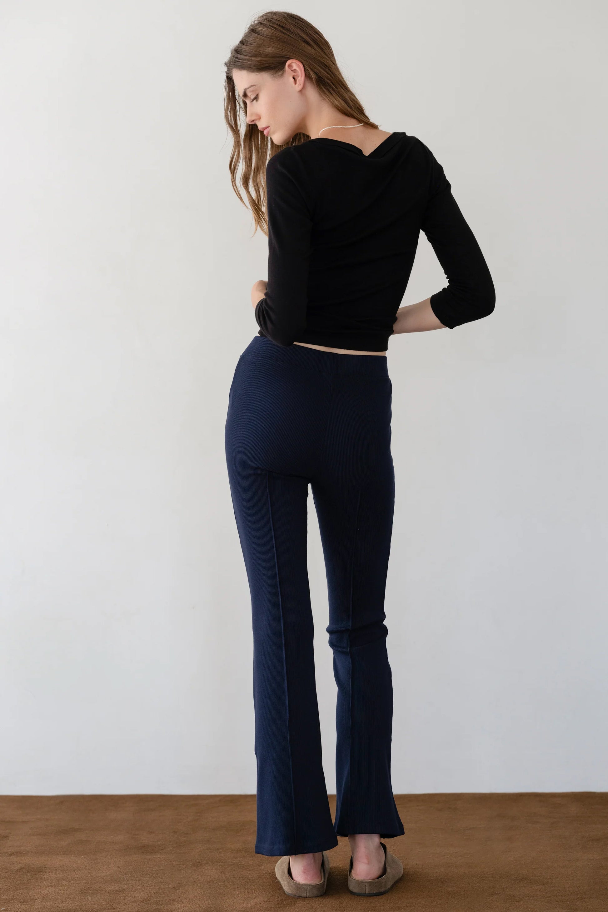- High-rise, with a close fit and flared hem