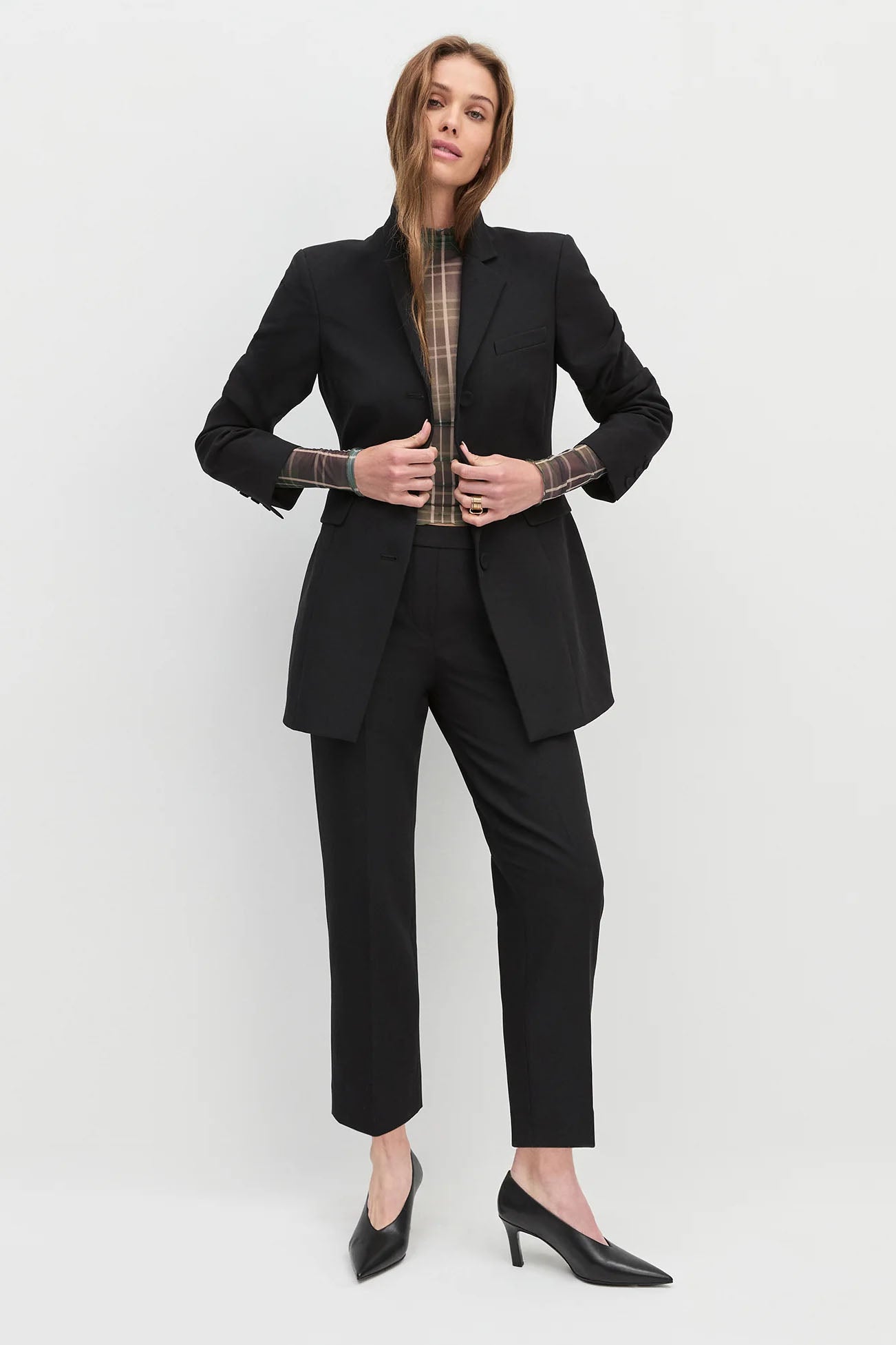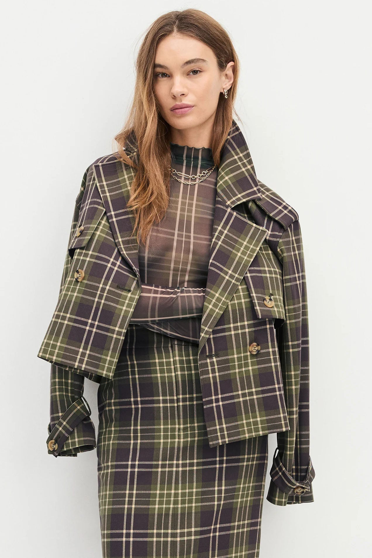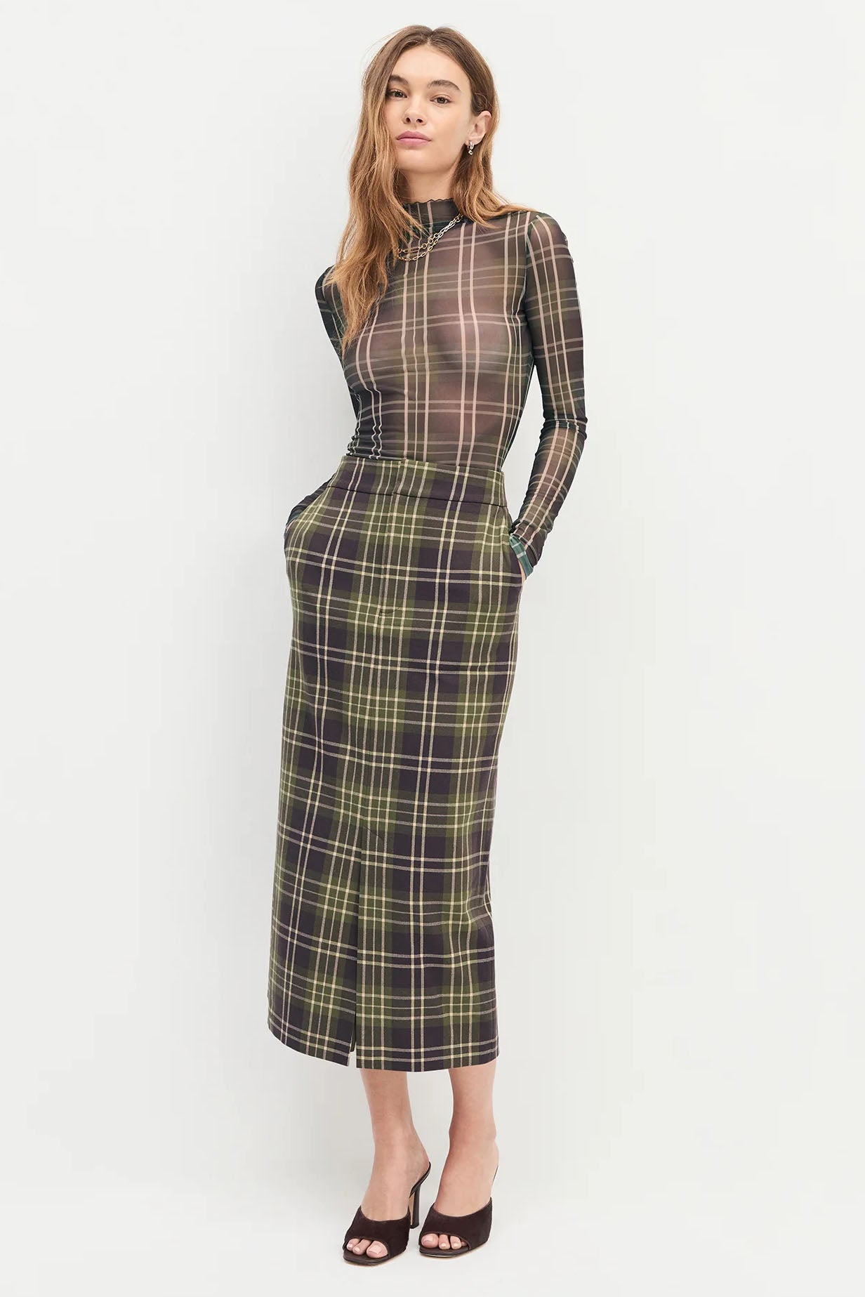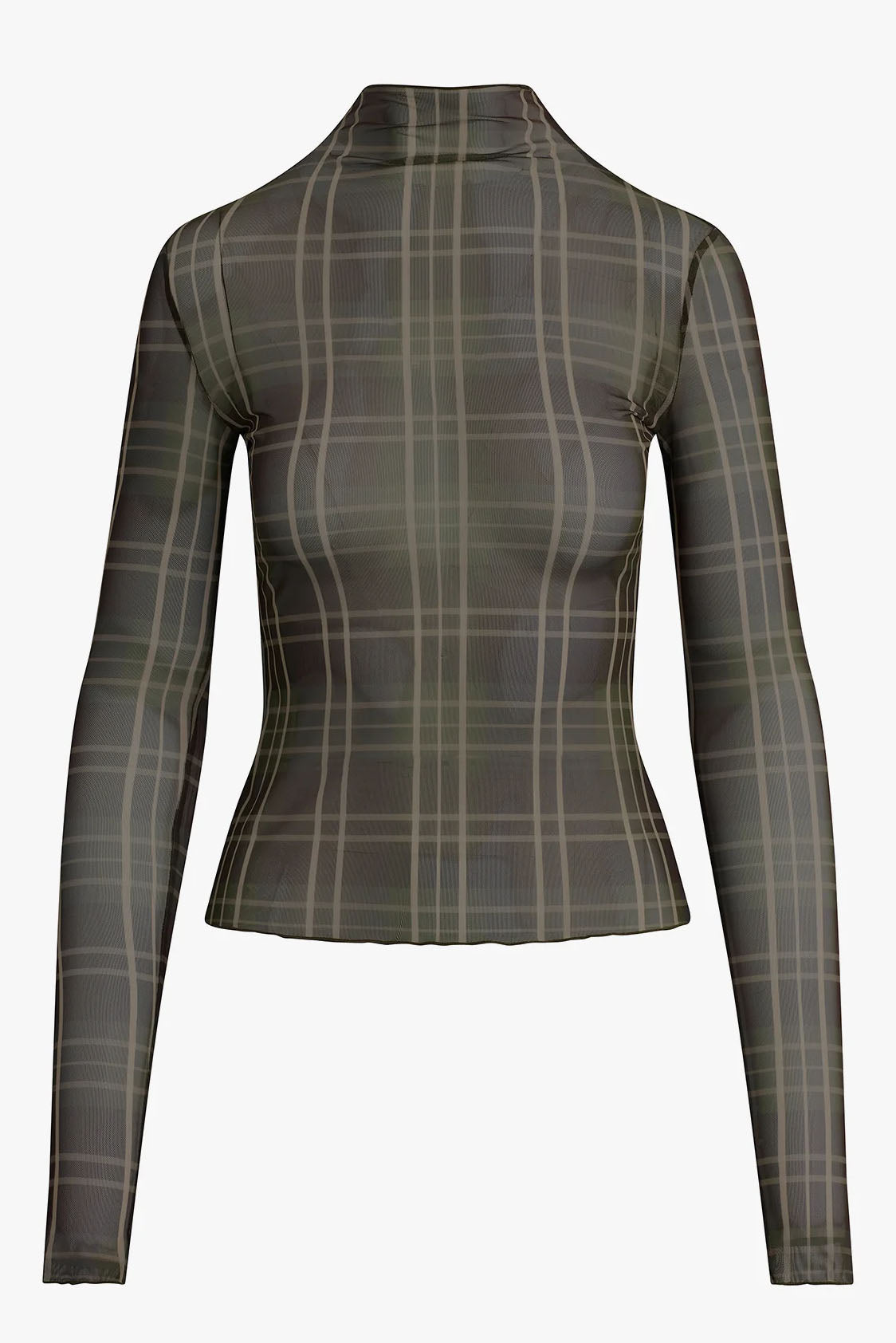 With a body-skimming fit, The Sheer Fantasy Top features a mesh mockneck and sheer sleeves. Pretty and plaid all at once.