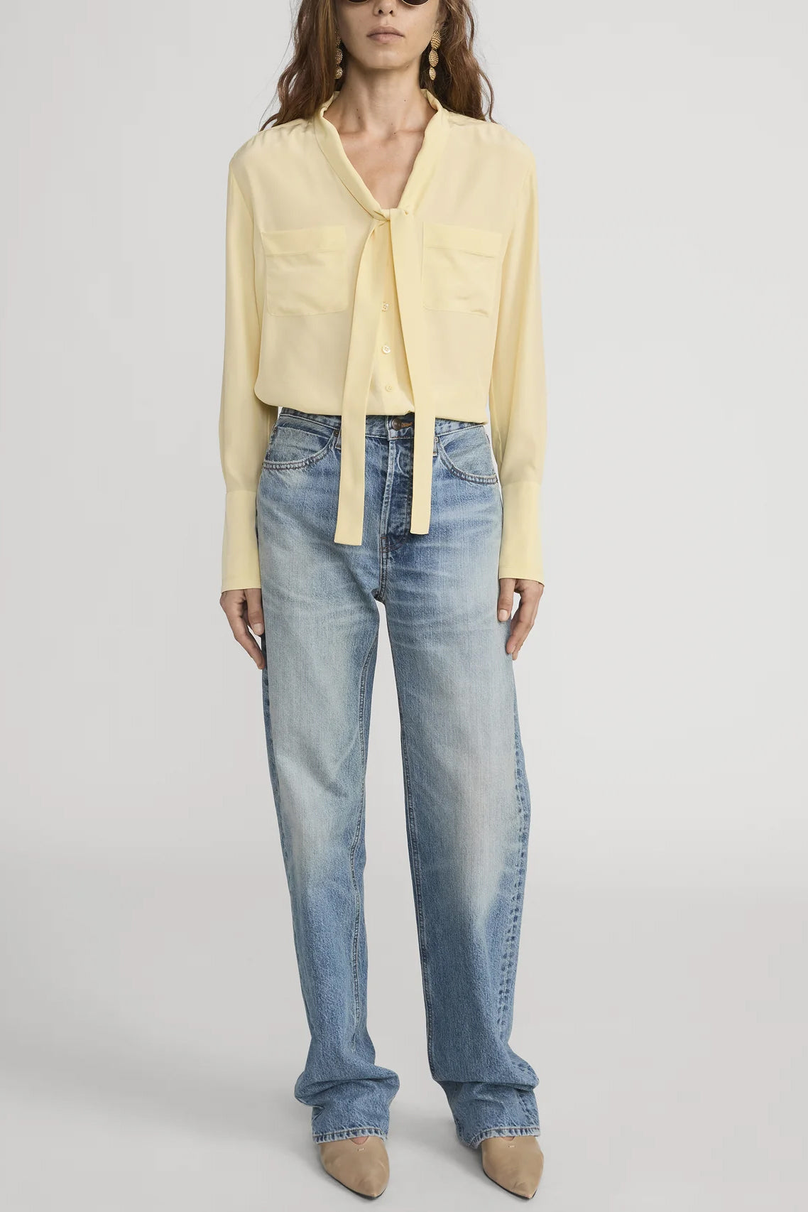 The Silk Modern Tie Blouse is crafted from 100% silk with a semi-sheer finish, featuring a soft tie-neck detail, double front pockets, and refined shirt cuffs—a best-selling silhouette reimagined in a new seasonal colorway.