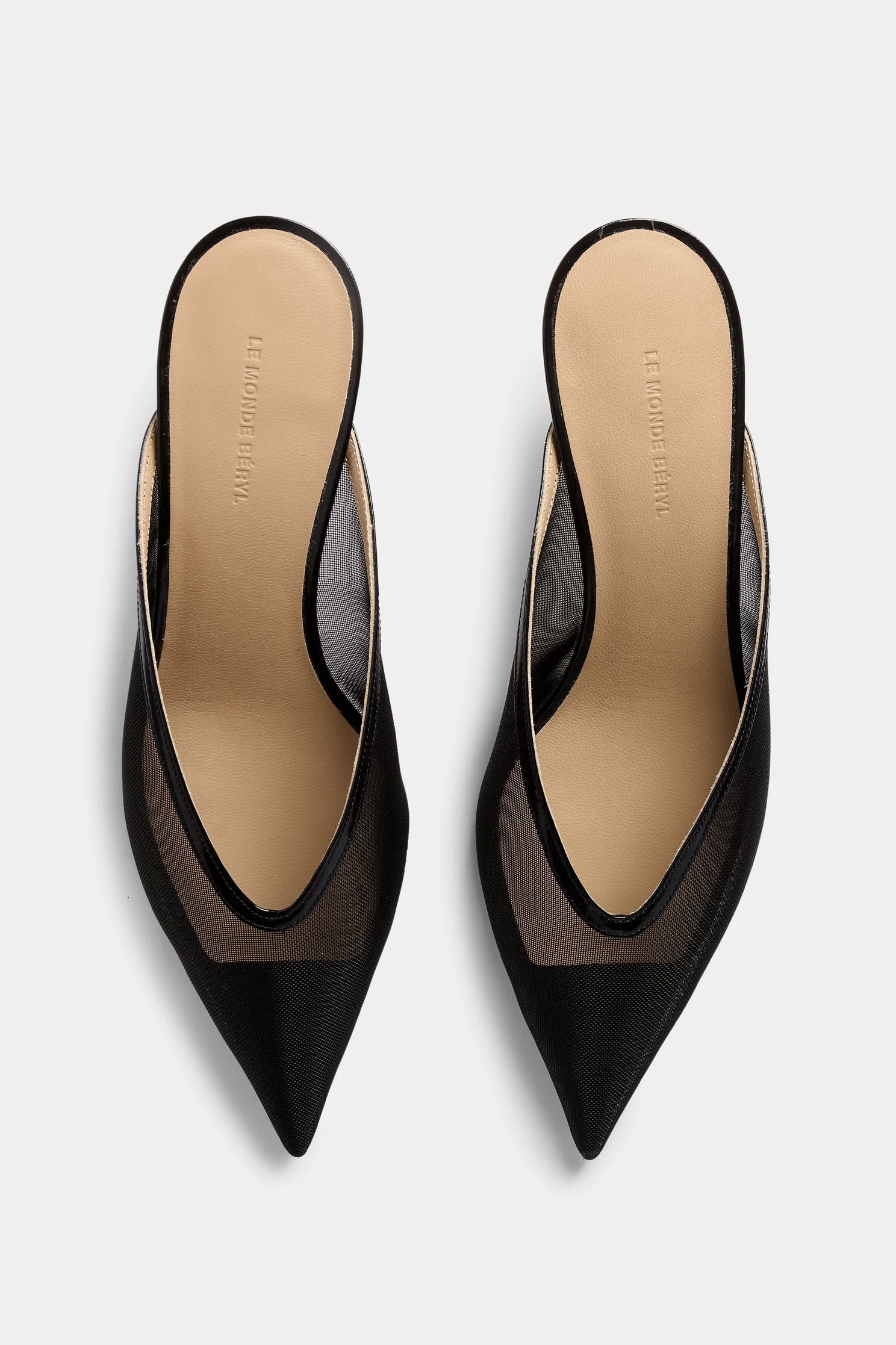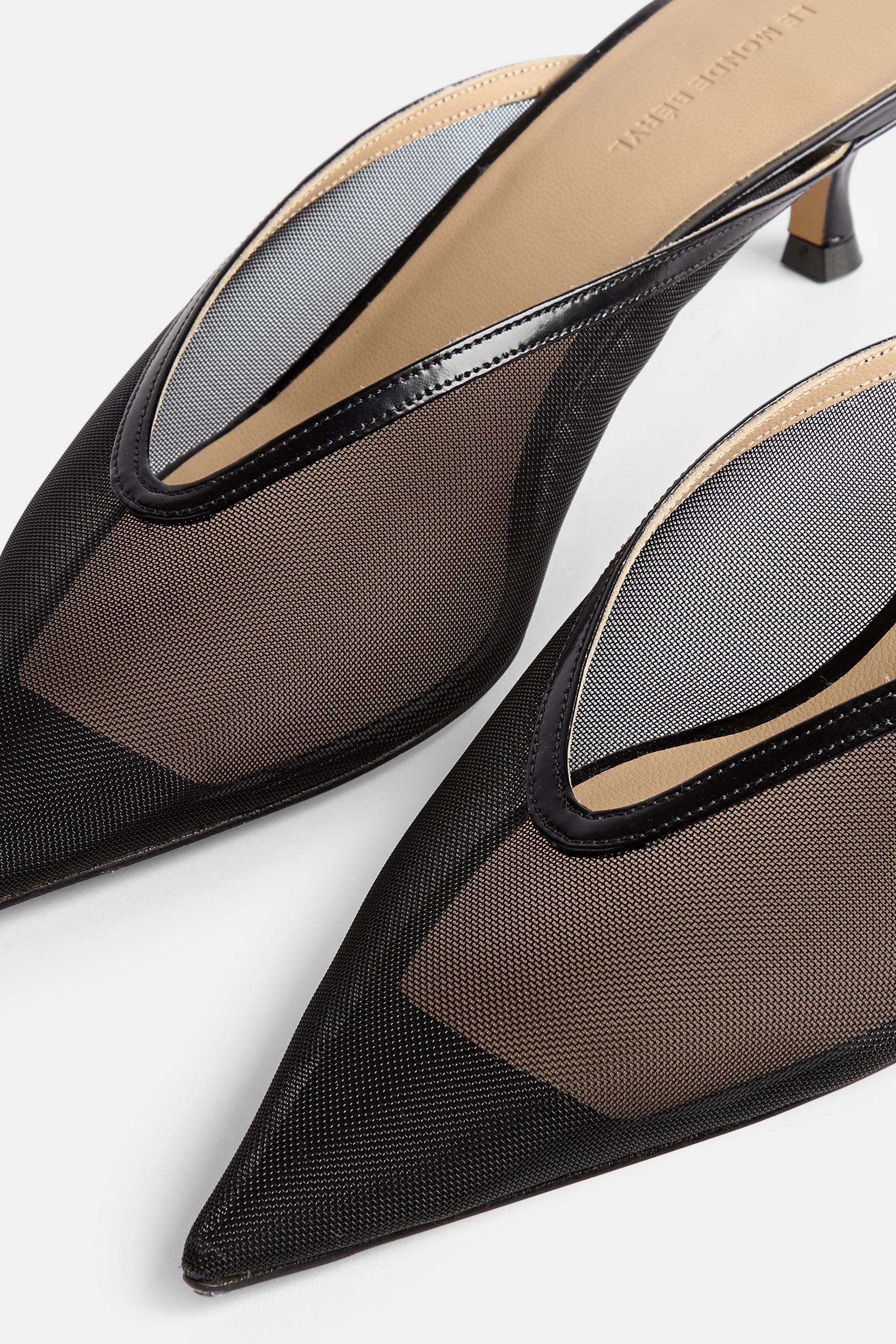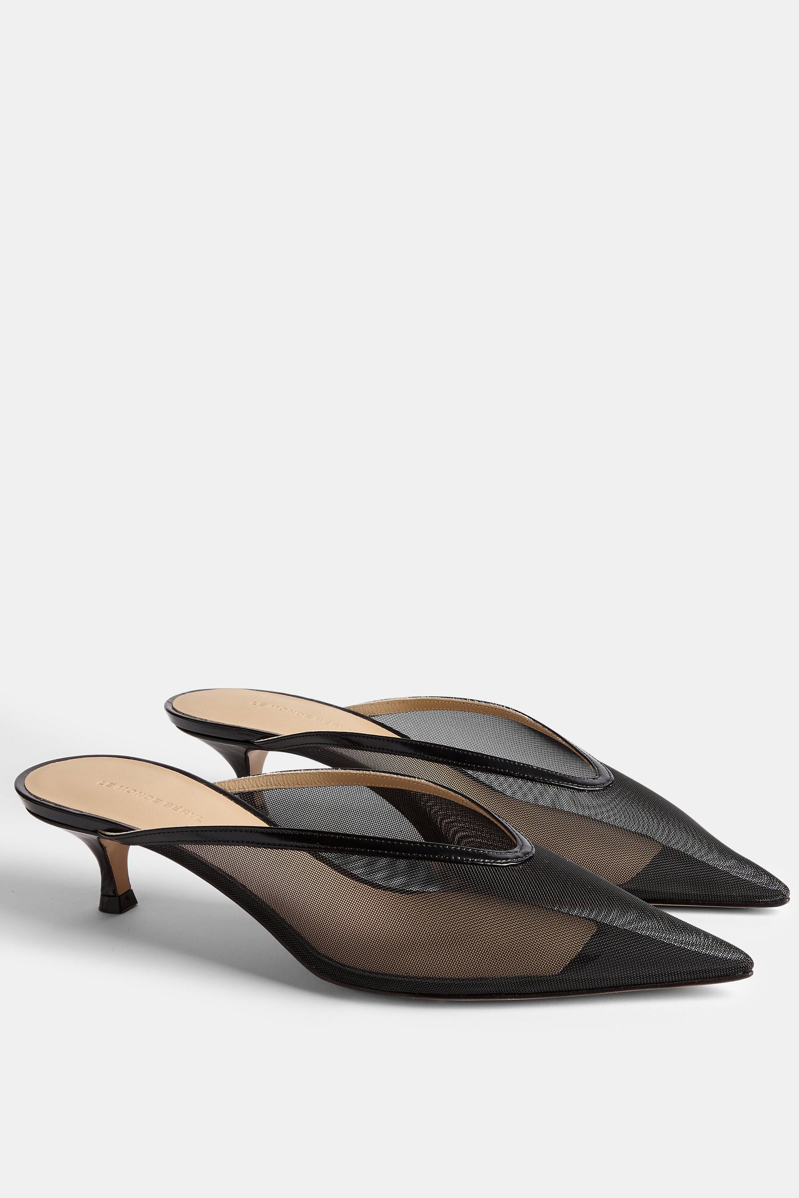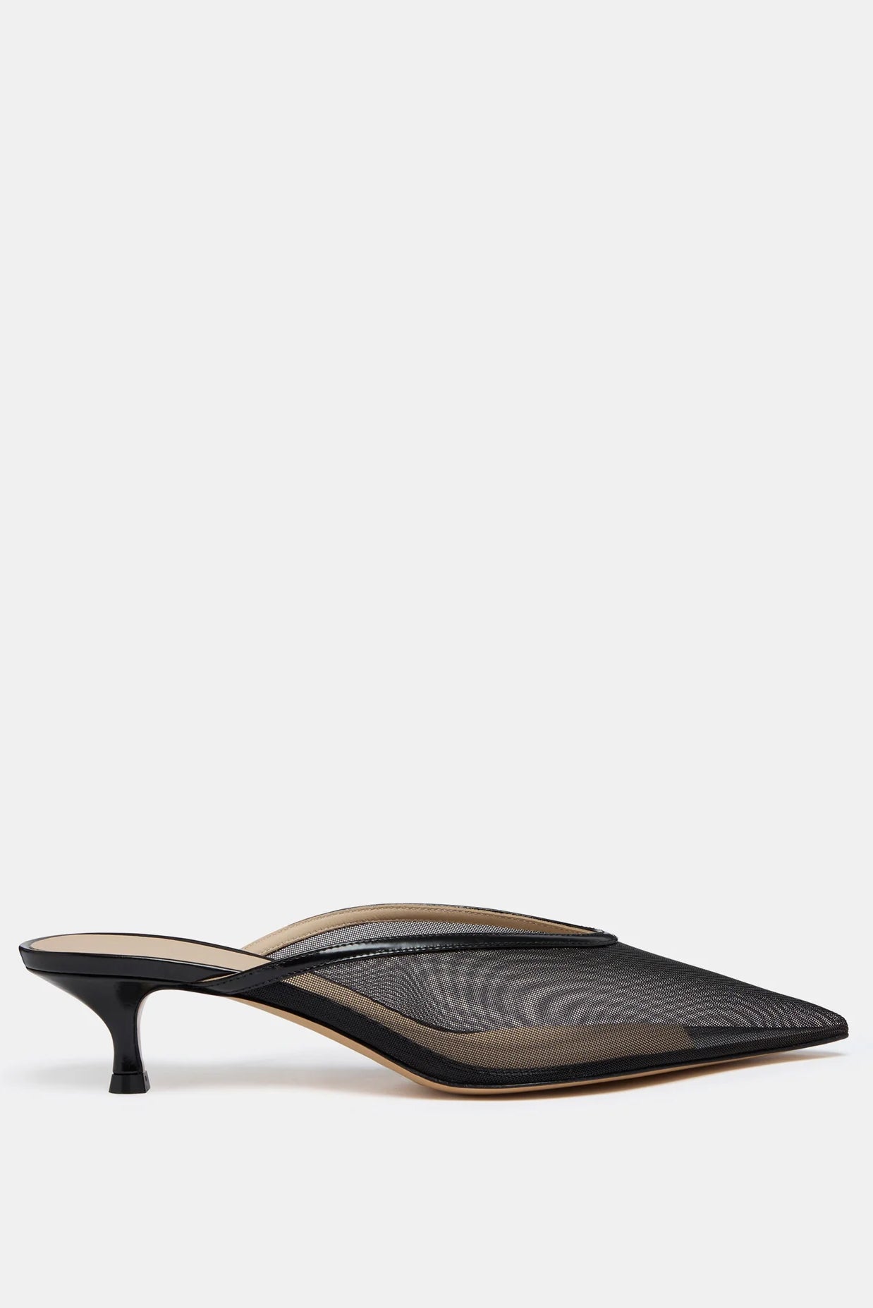 Venetian Kitten Mule, handcrafted in black mesh with a pointy toe, cushioned calf leather insole and a kitten heel. 40mm heel.