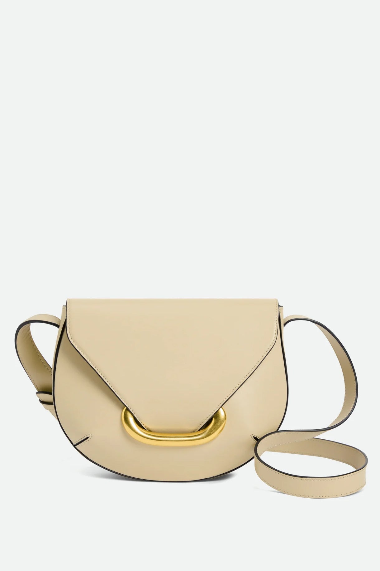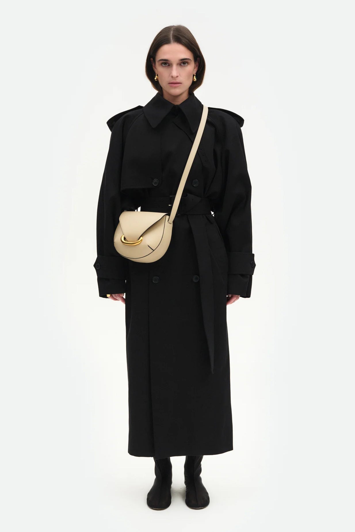 A rounded form with a signature clasp and elongated strap, designed for hands-free carry and everyday movement.