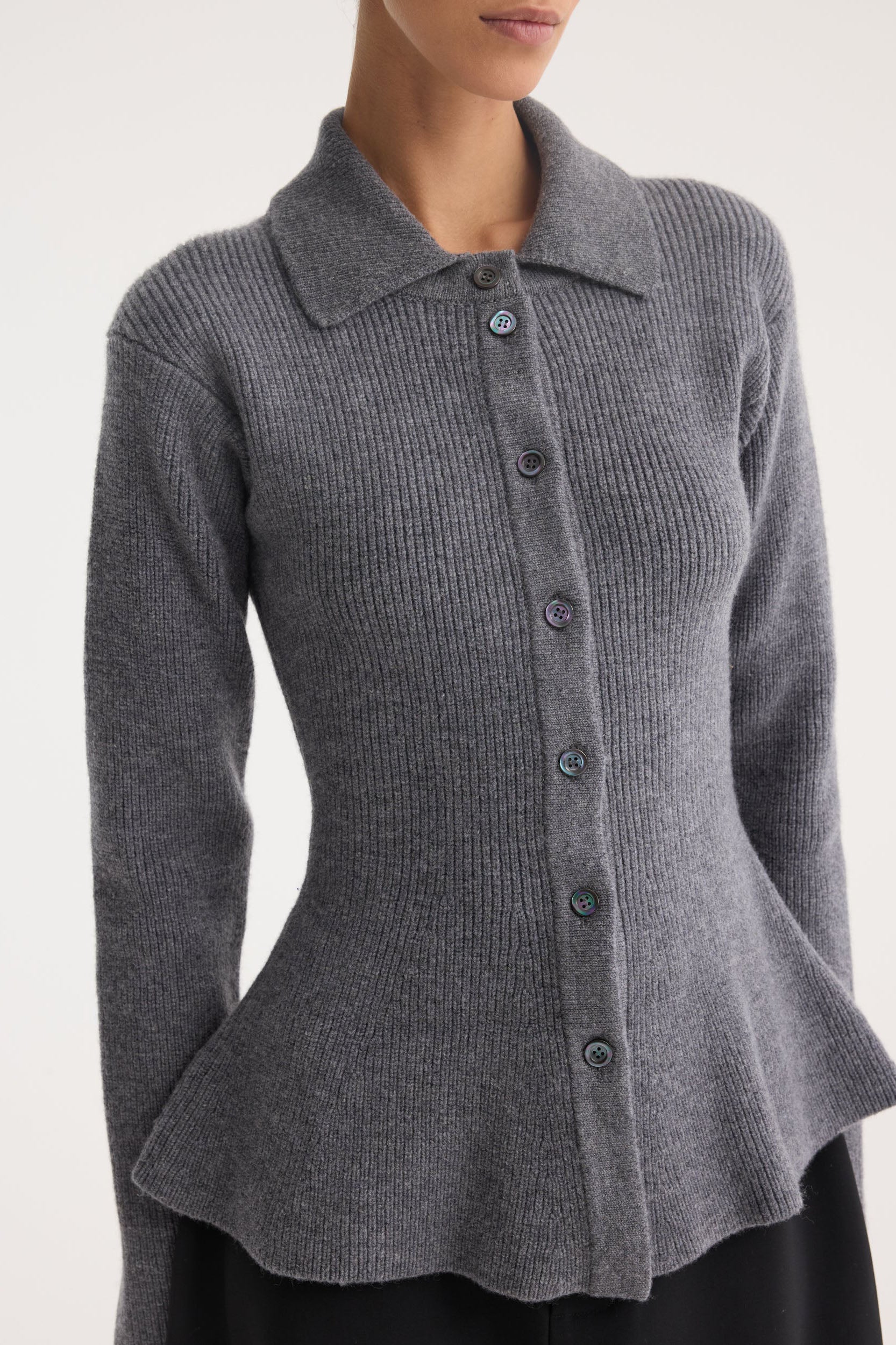 A waisted rib cardigan blending structure and softness in a high-quality wool and cashmere blend crafted by an Italian mill. The fitted silhouette is accentuated by a peplum flare starting at the waist, bringing movement and shape. A polo collar neckline and button-down front add a tailored touch to this knit essential.
